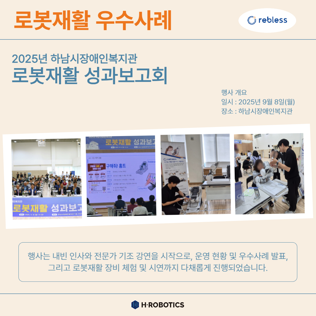 지난 9월 8일, 하남시장애인복지관(관장 민복기)에서는 ‘2025 로봇재활 성과보고회’가 열렸습니다.